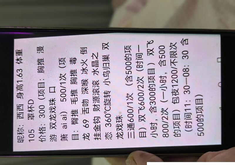 当时感觉是个姐姐,颜值也还可以,及格往上。印象深刻的就是胸,又大又圆,手感还很好,很有弹性。(不像有些胸,虽然大,但摸上去跟装了水的塑料袋一样,手感非常差。)我也年轻,精力足,第一次去做了大概20多分钟,服务态度很好不错。服务内容还有三通不过我不喜欢这口。有喜欢的朋友可以去尝试一下。还有个小姐妹能双飞下次去尝试一下